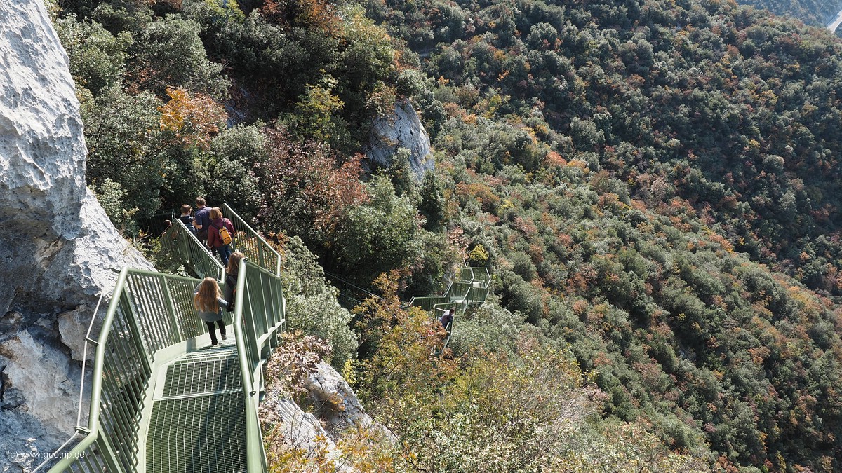 Durch schön bunten, herbstlichen Wald wandern wir nun stetig nach oben. Ab und an bieten sich herrliche Ausblicke auf den See und die Felswände auf der anderen Seite. Dann das erste Highlight. Eine Treppe die Steilwand herunter. Die Steige ist massiv und riesig, mit hohen Geländern.