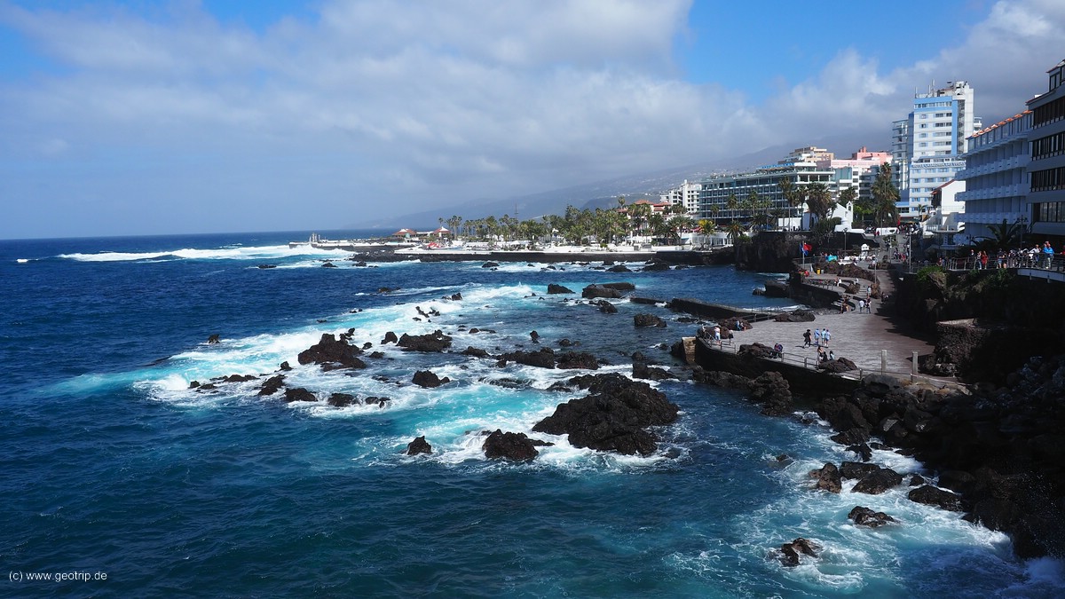 Mara findet sowieso die Läden spannender. Nach dem Besuch diverser landen wir an der Seafront. Hotelbunker stehen hier, aber die schwarze Lavaküste ist wirklich schön. Bei dem Wind heute schlagen riesige Brecher ein und überfluten die Badestelle. Es weht sogar eine rote Flagge und zwei Rettungsschwimmer stehen bereit. Aber wer ist denn so bescheuert bei diesen Bedingungen hier baden zu gehen?
