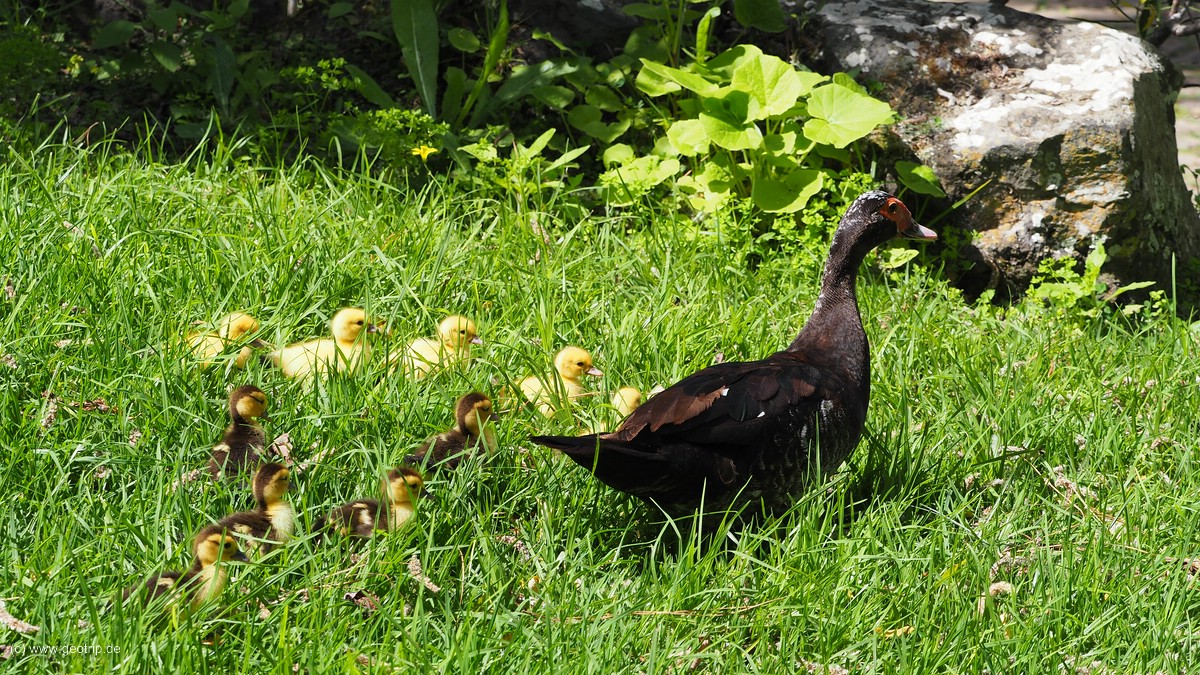 Und dann kommt die Attraktion! Zutrauliche Enten begleiteten uns schon vorhin, doch nun taucht eine Entenmama mit 10 Küken auf. 5 gelbe und 5 schwarze, die ganz süß hinter der Mama einmal über den Platz und die Wiese laufen und dann im Wald verschwinden.