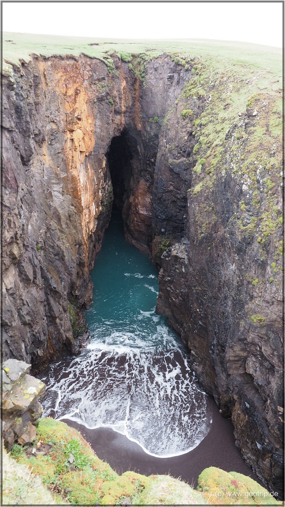 Ist natürlich etwas übertrieben, aber es sind nun 5,6 Grad und es nieselt waagerecht von vorne. Puffins sind keine zu sehen, also wandern wir entlang der Calders Geo, des Klippeneinschnitts um die Ecke. Wahnsinn wie tief das hier runtergeht. Und schwarzrot leuchtet das vulkanische Gestein über dem tiefblauen, rauen Meer.