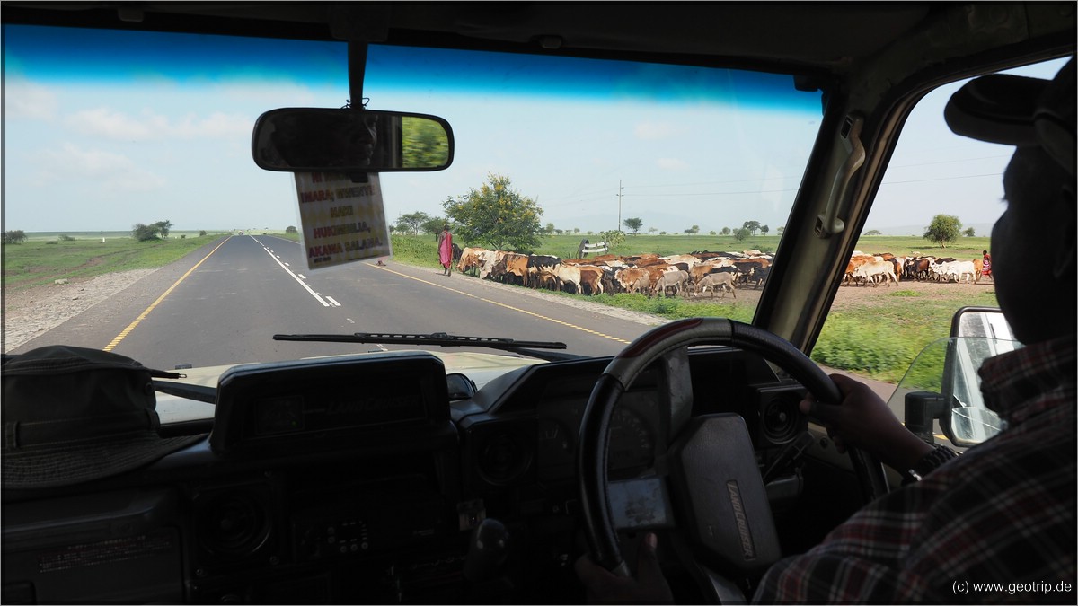 Wir müssen uns wieder durch Arusha quetschen. Aber es geht ohne großen Stau und bald fahren wir nach Süden. Auf bester Straße rollen wir nun dahin. Nach den ganzen Schuppen, ramponierten Häusern, Matsch und Mopeds zuvor breitet sich jetzt wohltuend grün rechts und links die Savanne aus. Übersät mit vulkanischen Bomben übrigens. Klar, wir fahren im Ostafrikanischen Grabenbruch. Da werden wir noch mehr vulkanische Aktivität sehen. Die spitzen Hügel links sind denn auch erloschene Vulkankegel.