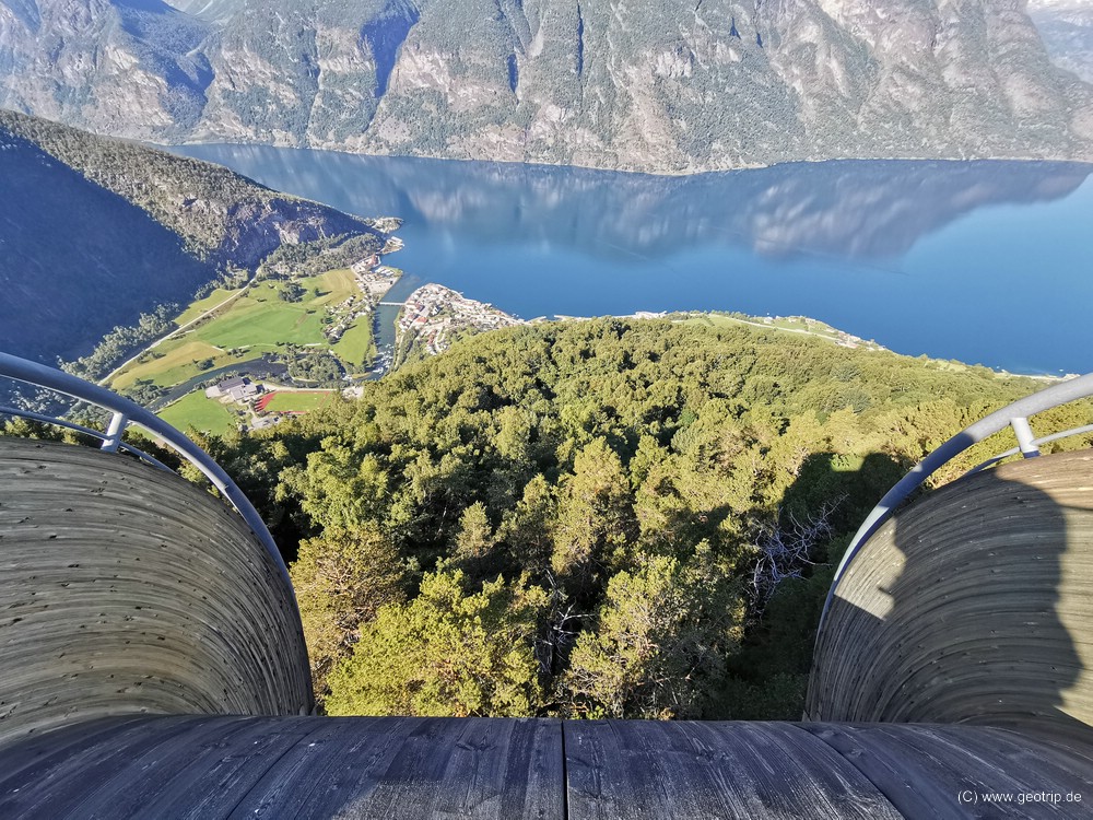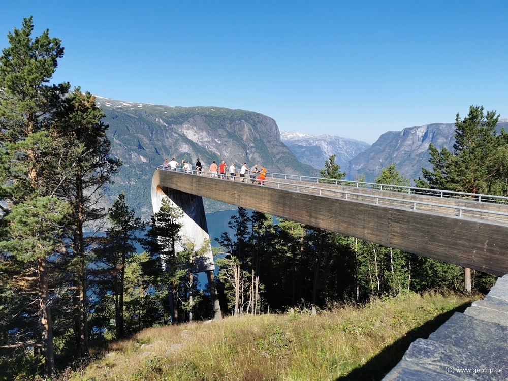 Egal nicht mein Problem, ich fahre weiter nach oben bis zur Stegastein Aussichtplattform. Ein geschwungener Holzbogen steht aus dem Hang heraus. Man läuft nach vorne bis über die Baumwipfel und hat einen wirklichen hervorragenden Blick. Im Sinne des Wortes. Die Architektur mit dem nach vorne abfallenden Holz ist aber nix für Leute mit Höhenangst.