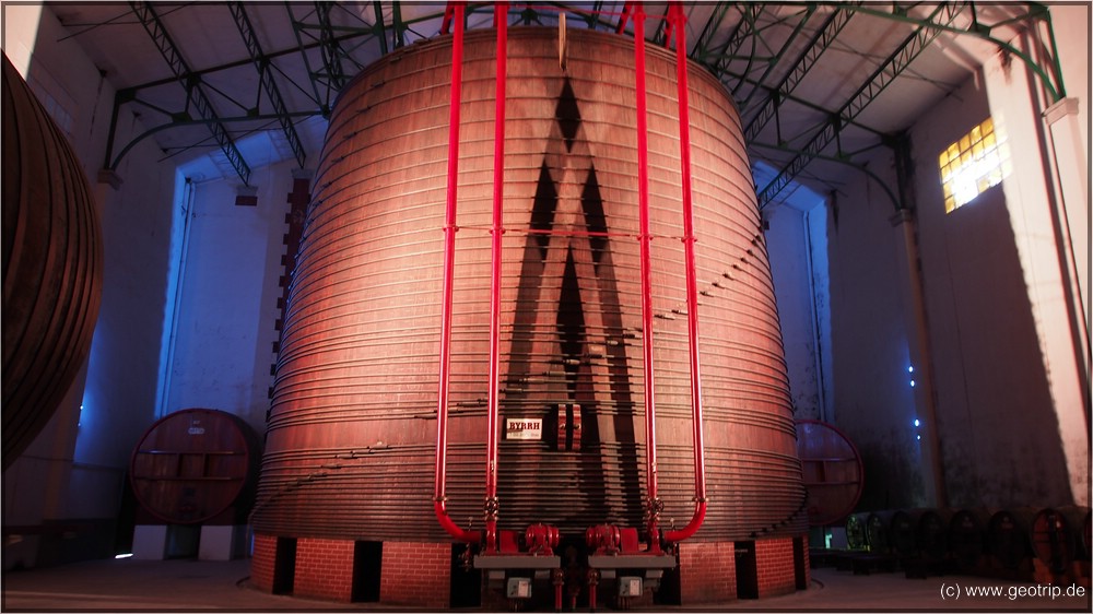 Bis jetzt hab ich auch noch gar nicht erwähnt was hier produziert wird, oder? Byrrh ist ein bittersüßer, der Farbe nach hellroter französischer Aperitif mit etwa 17 Vol.-%. Es handelt sich um eine Mischung aus Rotwein, aromatisiert mit Tonic Water, Auszügen von Chinarinde sowie bestimmten Gewürzen aus der Region Languedoc-Roussillon und internationalen Gewürzen wie Zimt, Bitterorangenschalen, Enzian, Echte Kamille, Kalumba, Kaffee und Kakao. Diese Zutaten bekommen wir denn auch alle gezeigt. Na Prost, wie soll das denn schmecken? Noch erfahren wir das nicht denn wir laufen jetzt auf das größte Fass überhaupt zu, Über 1 Million Liter passen da rein, da sieht das große Fass im Heidelberger Schloss aber wie Kindergeburtstag dagegen aus.