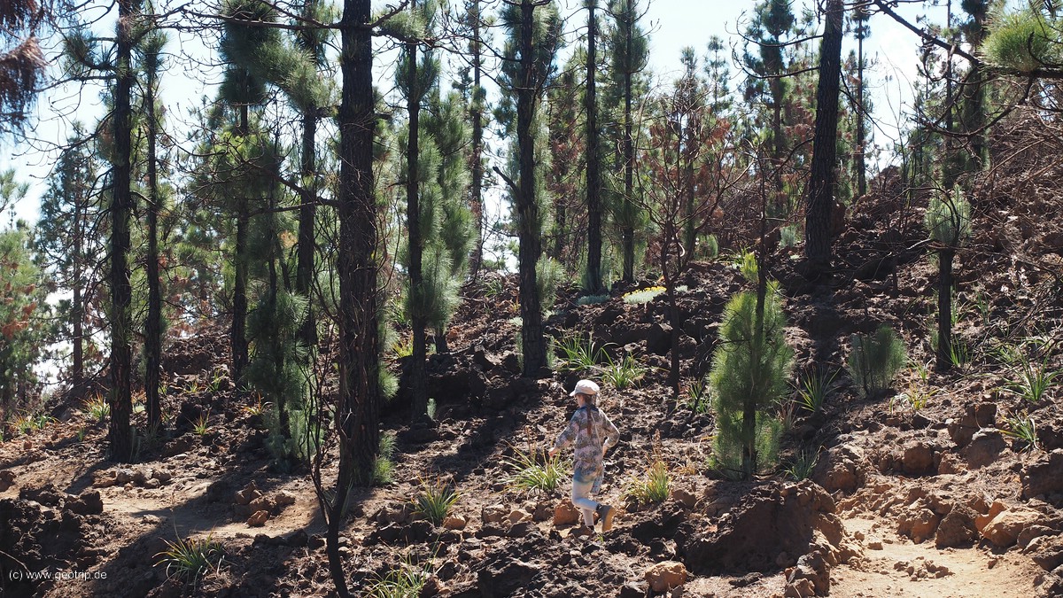 Kurz nachdem wir eine alte Wasserleitung passiert haben, ersteigen wir einen alten Lavastrom. Rotes Gestein, schwarze Stämme, grüne Nadeln und darüber ein leuchtend blauer Himmel – ein Wandermärchen.
