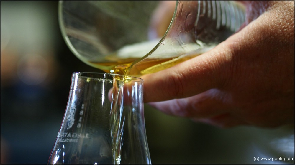 Nach knapp einer Stunde kommt Sabine glücklich wieder raus. Es gab 6 verschiedene Whiskies, New Make, Ten Years, 23, als Höhepunkt den 32 jährigen und noch weitere. Zudem sehe ich nachher an den Bildern, dass im Warehouse alles seltsam abgesperrt ist, und ausserdem war die Gruppe 45 Leute stark! Tja, alles wird schlechter, aber für 15 Pfund kriegt man trotzdem einiges geboten. Sowohl Iain als auch die edlen Tropfen waren auch dieses mal ein Erlebnis. Zum ausklingen, laufen wir noch etwas die Strasse hoch, dann rechts ab und zur alten Ruine auf der Felsklippe. Von hier hat man einen schönen Blick auf das düstere Meer und natürlich auf die Brennerei-Gebäude.