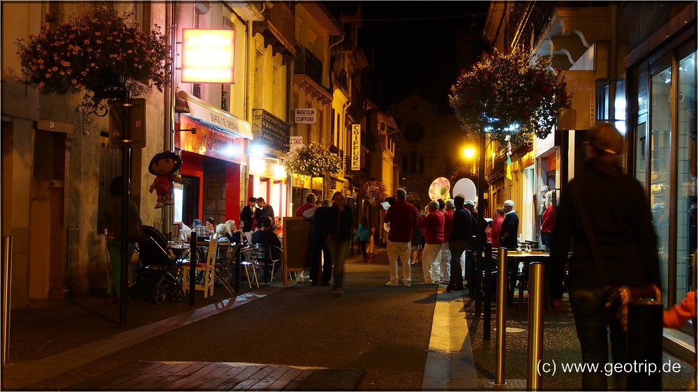 Der Weg ist gar nicht weit, wir wundern uns schon über soviele welke Blüten auf der Straße, als wir unversehens das Zentrum finden. Und im Zentrum eine Riesenparty. Hier ist um halb 10 noch was los, die Straße ist gesperrt, Fresstände alle paar Meter, Ufftata Bands und gute Stimmung. Wir stürzen uns ins Getümmel. Auf einem Plakat entdecken wir: hier findet die Fete de la Fleur statt. Jetzt wird uns einiges klar. Deshalb der übervolle Stellplatz. Wir feten ein wenig mit und kaufen unserer Tochter so einen blöden Ballon. Ein Einhorn. Sie freut sich kurz, überlegt sich dann aber dass sie doch lieber ein Hello Kitty haben wollte. Wir kriegen die Krise, aber um des lieben Friedens willen tauschen wir das Ding nochmal um. So jetzt ist Tochter auch endlich glücklich, es ist 11, wir können endlich nach Hause gehen.