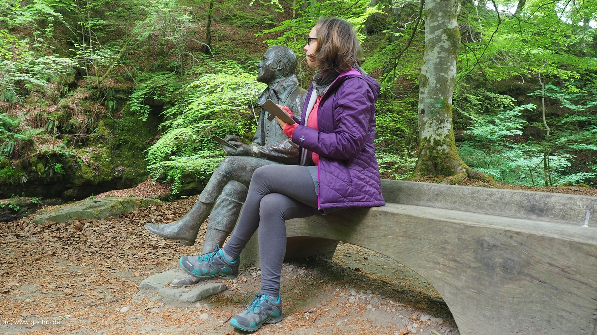 Eigentlich wollen wir auch hier einen Geocache suchen. Der Ort ist eindeutig, denn Robert Burns sitzt unübersehbar auf einer Bank und dichtet gerade. Doch wir finden nichts.