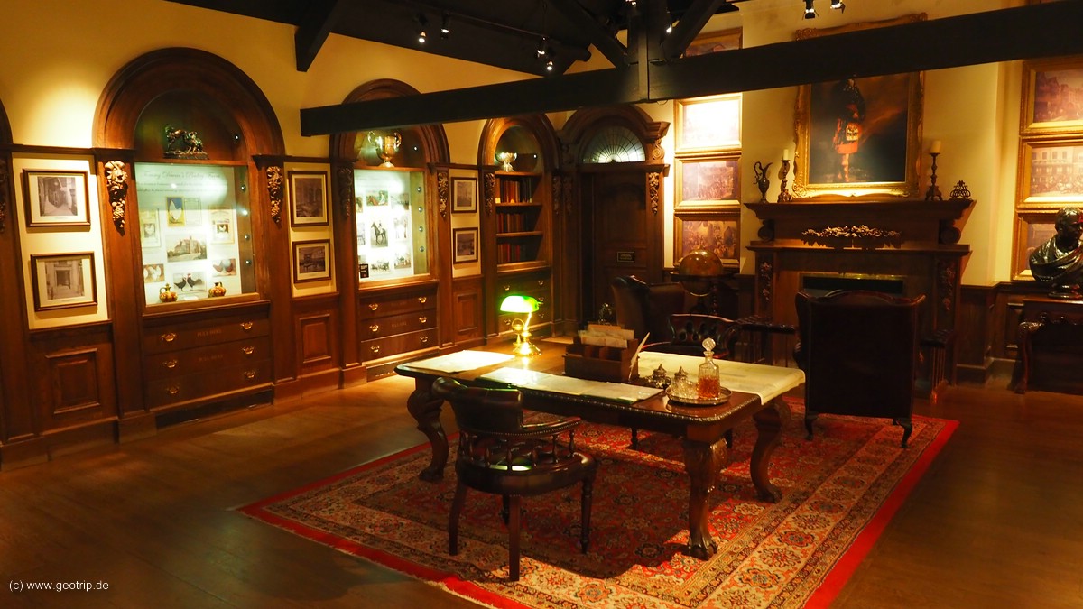 Zur Tour gehören ein Film und das ‚Museum‘. Der Film ist ganz nett, dauert aber zum Glück auch nicht allzu lange. Das Museum ist dafür richtig gut gemacht. Man bekommt ein Tablet und darf damit quasi in Dewars Wohnzimmer der Jahrhundertwende herumlaufen. Scannt man ein an den Exponaten angebrachtes Symbol, bekommt man zusätzliche Erklärungen. Schön gemacht, auch die große Sammlung an Originaldokumenten und Fotos.