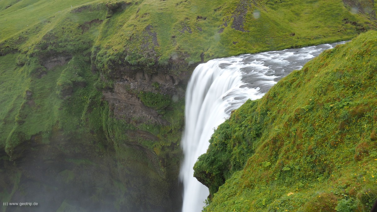 Auch der Skogafoss geht gut zur Sache. Hier kann man zwar nicht dahinter laufen, aber auf unzähligen Treppen auf eine Plattform oberhalb steigen.