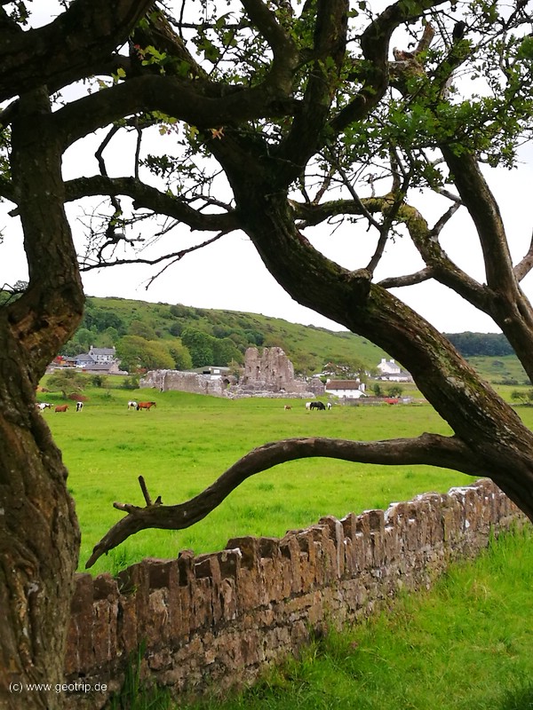 Das Castle liegt aber gleich oberhalb. Es ist kein Castle mehr, sondern nur noch ein paar Mauern im Gras. Mit Schafen davor und Schafkötteln garniert.